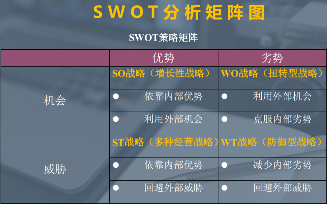 将企业的内部优势与外部威胁相组合进行分析,目的是利用企业优势回避或减轻外部威胁的影响。