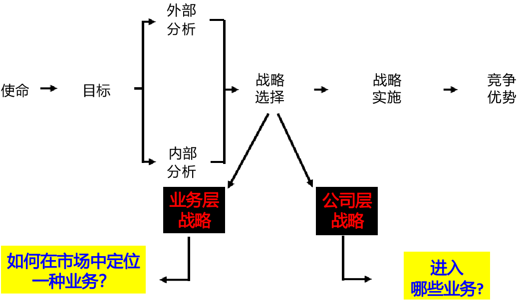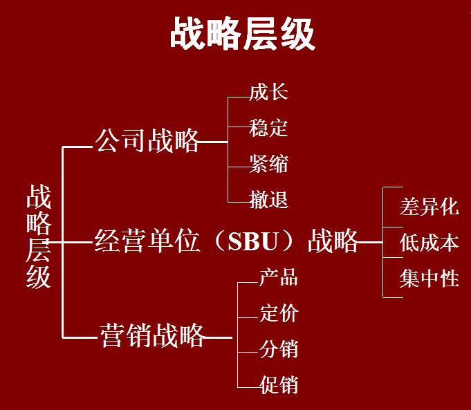 一个完整的企业战略分为三个层次:公司总体战略、经营单位(业务层)战略、职能战略。