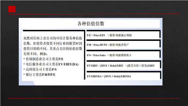 虽然对任何上市公司均可以计算各种估值倍数,但投资者投资不同行业的股票时因投资目的的不同,其重点关注的估值倍数有所不同。例如: