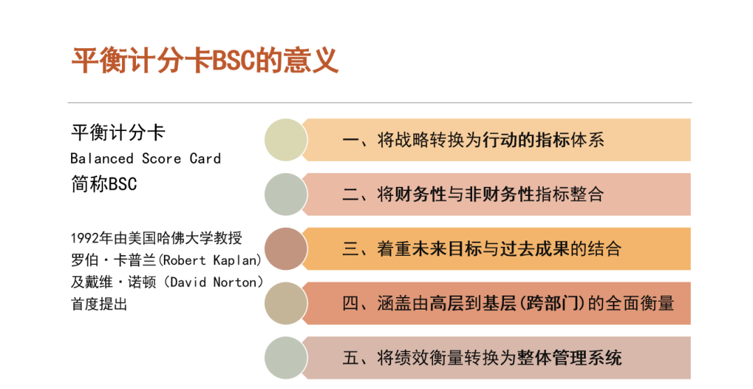 要实现公司的发展战略,必须要把公司的发展战略落实到每一个员工身上,企业可以利用平衡计分卡规划系统性的发展战略,配合战略发展提供评估信息;利用平衡计分卡结构发展衡量指针,建立整合性绩效衡量体系;运用平衡计分卡诱导企业均衡发展。