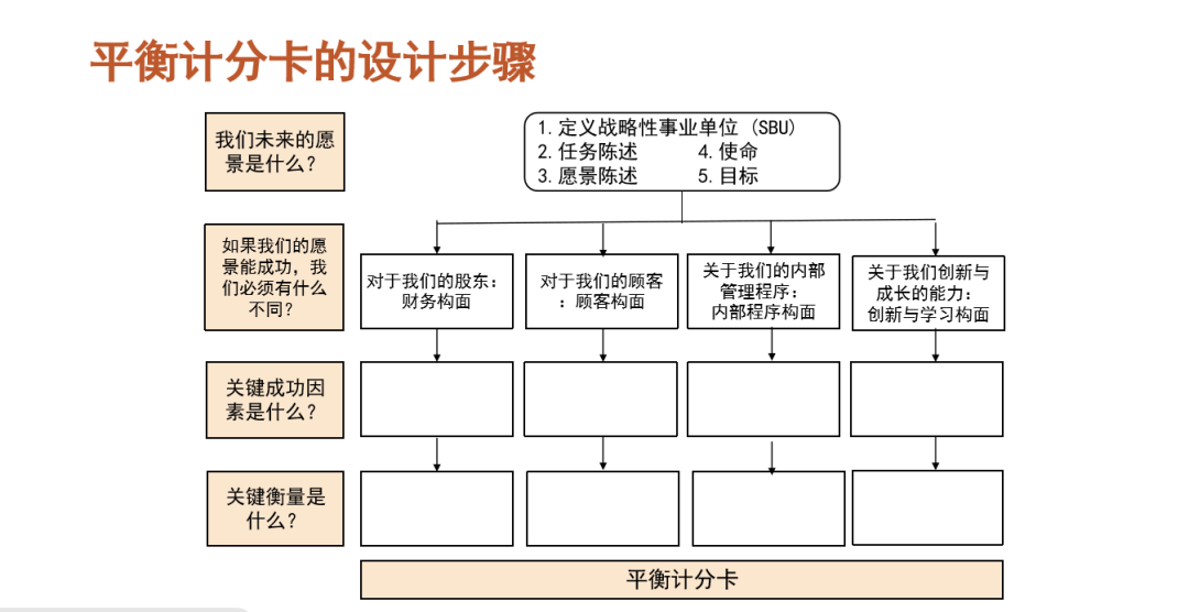 平衡计分卡的发展过程中特别强调描述战略背后的因果关系,借客户构面、内部运营构面、学习与成长构面评估指标的完成而达到最终的财务目标。