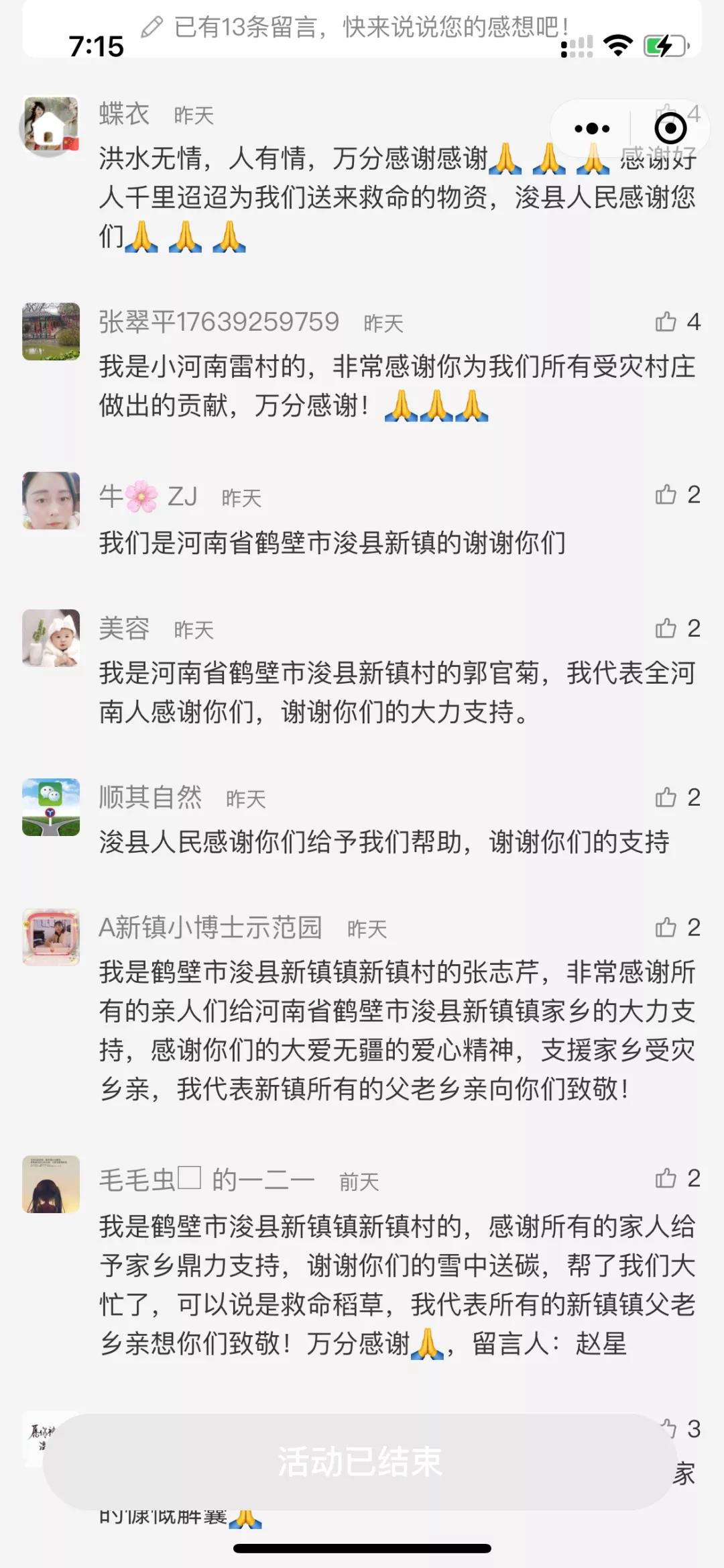 7月28日,就职于河南省鹤壁市文化广电和旅游局的亚商117期学生李岩提供灾区信息,指河南省鹤壁市浚县受特大洪水自然灾害,县城周边村庄几乎全部淹没。因为河南省鹤壁市浚县周边六个村庄成为了上流泄洪口,目前已成一片汪洋!几十万村民连夜搬离住所,虽然村民已被安置,但是抗洪一线依旧紧缺救援物资,像救援的必要物资周边因需求量太大购买不到,实在没有办法向亚商请求支援!