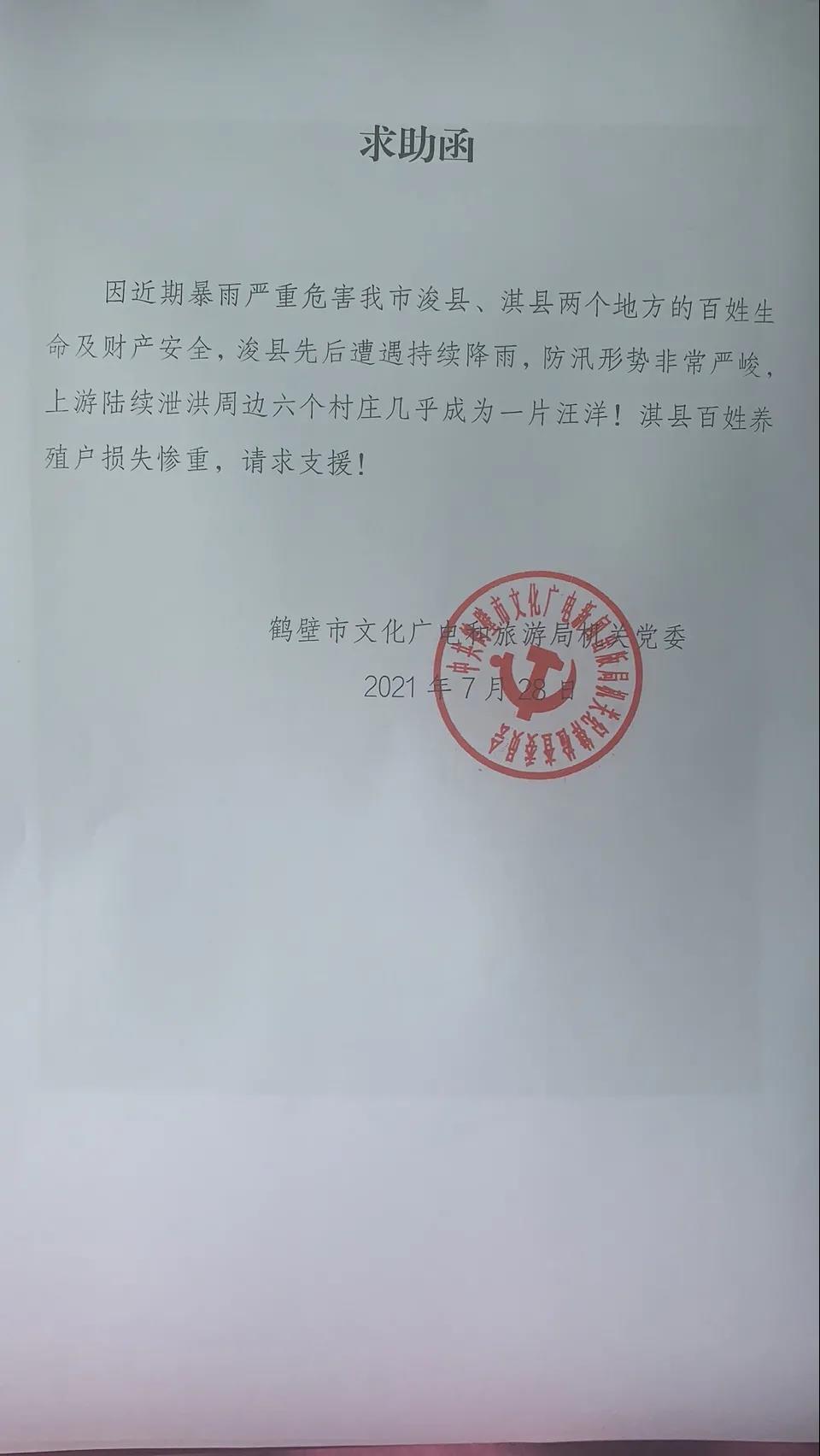 7月28日,就职于河南省鹤壁市文化广电和旅游局的亚商117期学生李巖提供灾区信息,指河南省鹤壁市浚县受特大洪水自然灾害,县城周边村庄几乎全部淹没。因为河南省鹤壁市浚县周边六个村庄成为了上流泄洪口,目前已成一片汪洋!几十万村民连夜搬离住所,虽然村民已被安置,但是抗洪一线依旧紧缺救援物资,像救援的必要物资周边因需求量太大购买不到,实在没有办法向亚商请求支援!