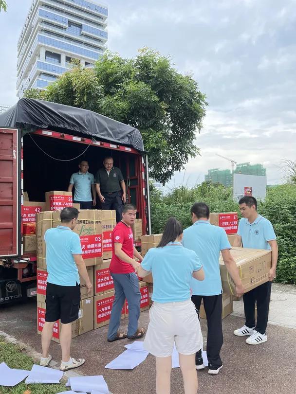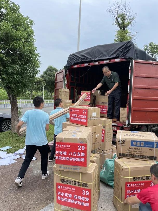 7月30日上午9时,亚商院长黄亮、同学会会长许建平、招生中心负责人罗东彬以及亚商学子们在亚商东莞总部一楼搬运物资,虽然天气炎热,同学们汗流浃背,但他们丝毫没有退缩、休息,在大家通力合作下,很快就将救灾物资搬运上车。10时,救援专车带著101位亚商师生的祝福和心愿,从东莞出发,奔赴重灾区河南省鹤壁市浚县。