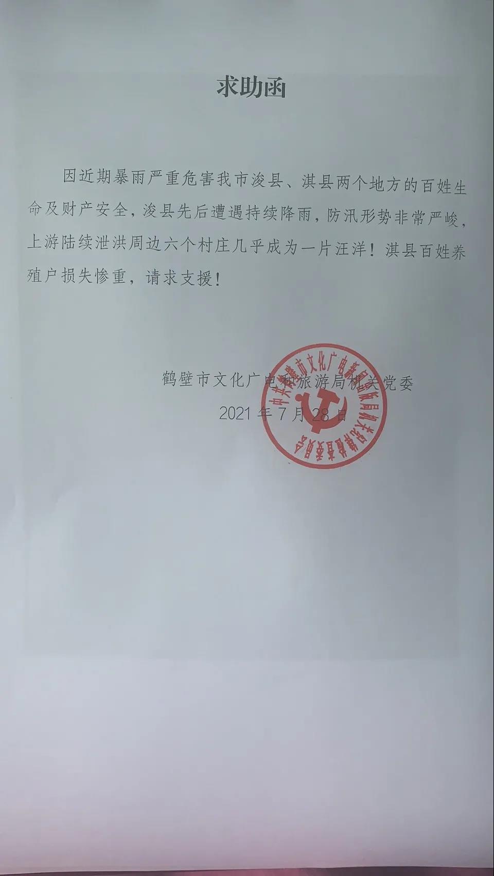 7月28日,就职于河南省鹤壁市文化广电和旅游局的亚商117期学生李岩提供灾区信息,指河南省鹤壁市浚县受特大洪水自然灾害,县城周边村庄几乎全部淹没。因为河南省鹤壁市浚县周边六个村庄成为了上流泄洪口,目前已成一片汪洋!几十万村民连夜搬离住所,虽然村民已被安置,但是抗洪一线依旧紧缺救援物资,像救援的必要物资周边因需求量太大购买不到,实在没有办法向亚商请求支援!