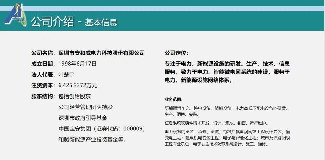 深圳市安和威电力科技股份有限公司成立于1998年,国家认定的高新技术企业,公司专注于电力、新能源设施的研发、生产、技术、信息服务,致力于电力、智能微电网系统的建设,服务于电力、新能源设施网络体系。在深圳、青岛设立了研发中心,深圳拥有2万多平方米自主产权的生产工业园区。是一家集产品的研发、生产、运营和工程项目施工的现代化企业。