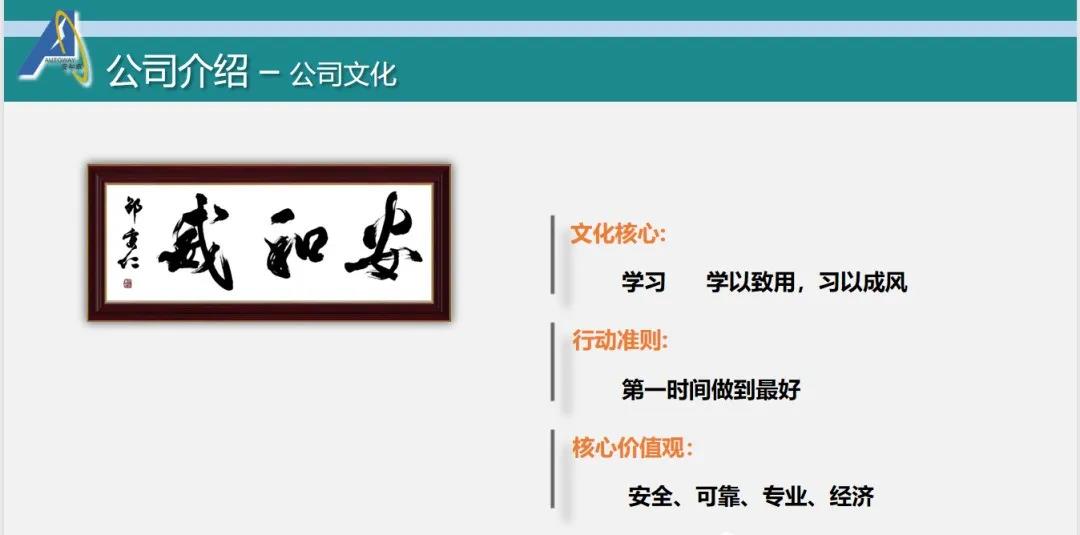 讲到公司文化这一块,熊冰同学表示学习,是企业文化的核心。安和威一直倡导全员学习,做学习型企业;秉持学以致用、习以成风的精神,为客户提供“安全、可靠、专业、经济”的产品和技术服务。