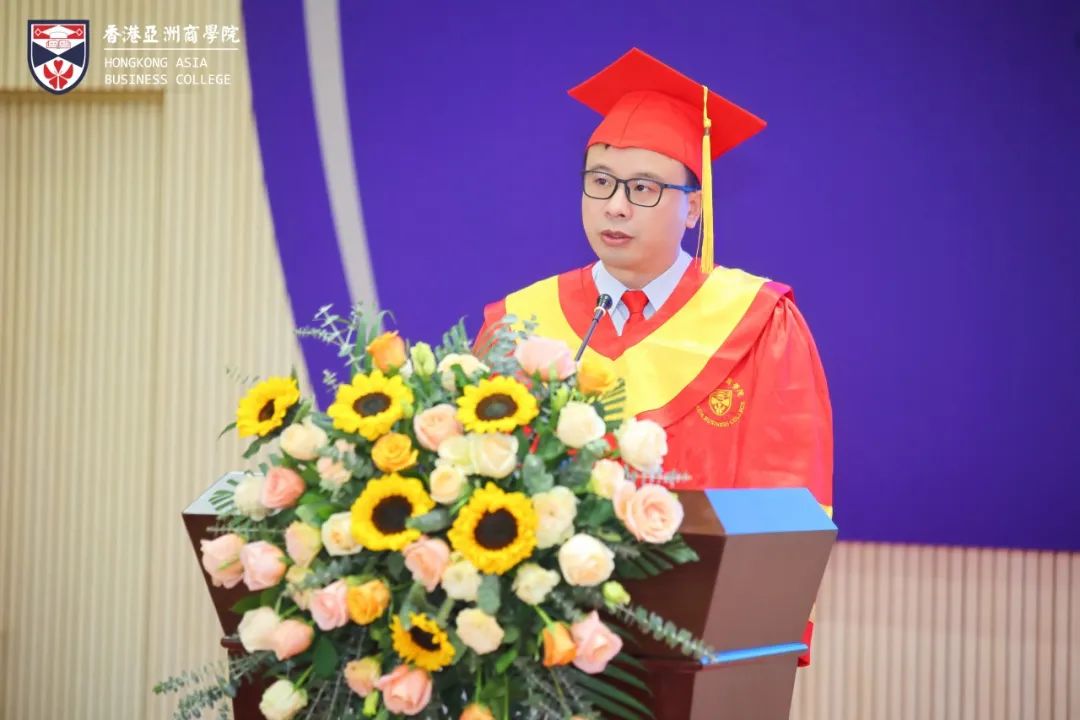 在此我谨代表香港亚洲商学院,向接受各种考验,完成学业的同学们致敬并致以诚挚的祝贺,恭喜你们毕业了;向支持你们完成学业的亲友和付出辛勤汗水的老师们致敬!向在特殊时期仍然支持关心亚商发展的社会各界致敬。