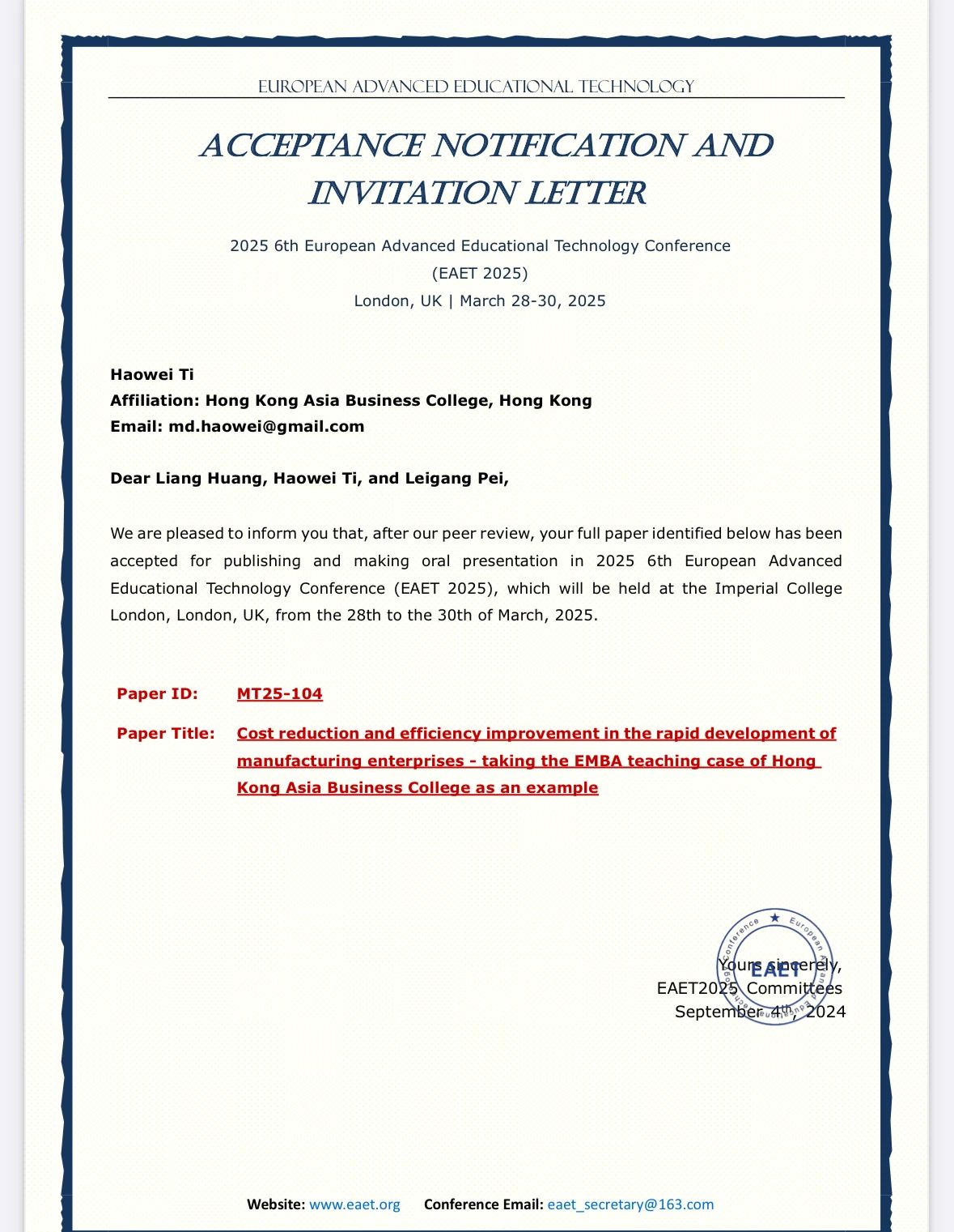 同时,香港亚洲商学院提交论文:《制造型企业如何在快速发展中降本增效》,正式通过本届学术会议同行评审,并将在帝国理工学院举行的年度会议中做主题演讲。